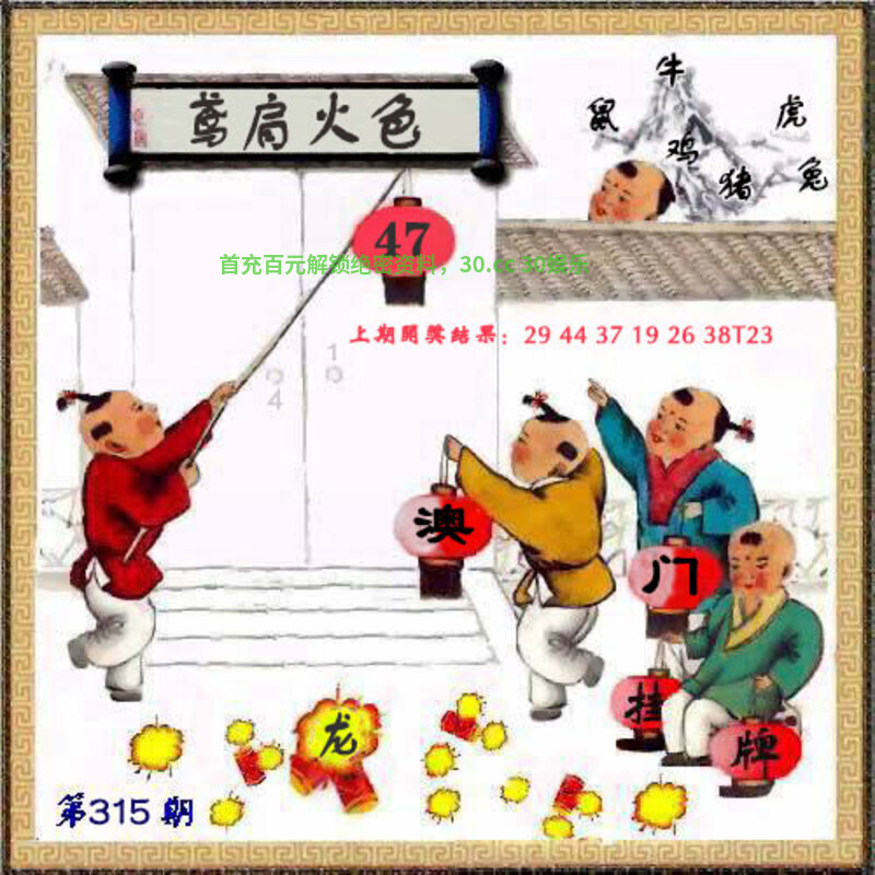 316期:澳门内幕传真 今期生肖一五开,三四三六都是数。 大将桃花找小姐,老牛骑马倒着走。 祸害田地和庄稼,今年农作打水漂。 一一相见旧码现,见四吼四波旺蓝。 一夜暴富 解:今期生肖一五开,三四三六都是数。一五解兔,三四解猴,三六解马。大将桃花找小姐,老牛骑马倒着走。大将解牛虎,桃花解虎,明肖牛马。祸害田地和庄稼,今年农作打水漂。水肖鼠猪。一一相见旧码现,见四吼四波旺蓝,一一解羊,四解虎,蓝波。 拐特九肖:兔猴马牛羊狗龙蛇鸡 主特码:39.46.24.29.23.20.38.49.45 |